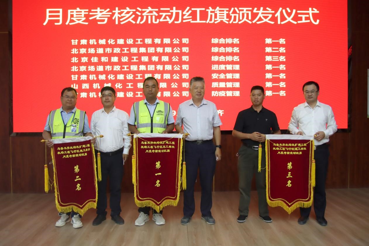 此次會議對施工單位八月份的相關(guān)工作進(jìn)行了綜合考核,我司烏魯木齊機場項目經(jīng)理部在8家施工單位評比中獲得綜合第一名、安全第一名、防疫第一名的好成績,得到了業(yè)主方、擴(kuò)建指揮部及監(jiān)理單位的一致認(rèn)可。同時會議對九月份全場飛行區(qū)工程的相關(guān)工作進(jìn)行了部署,下達(dá)了各標(biāo)段施工任務(wù)。